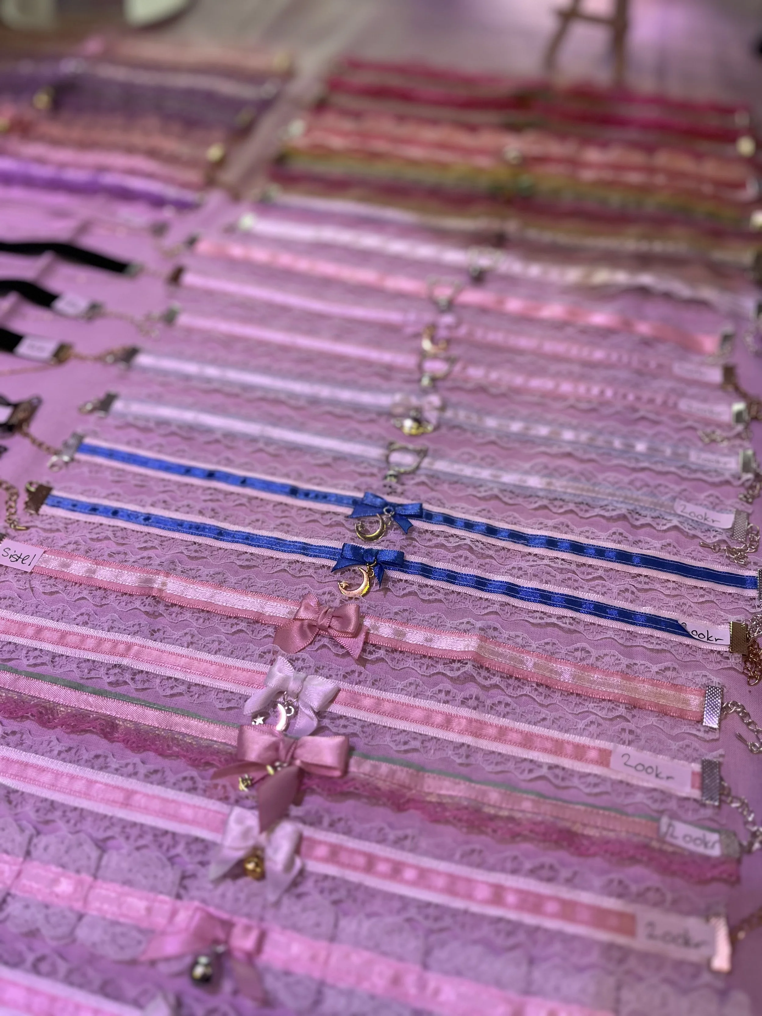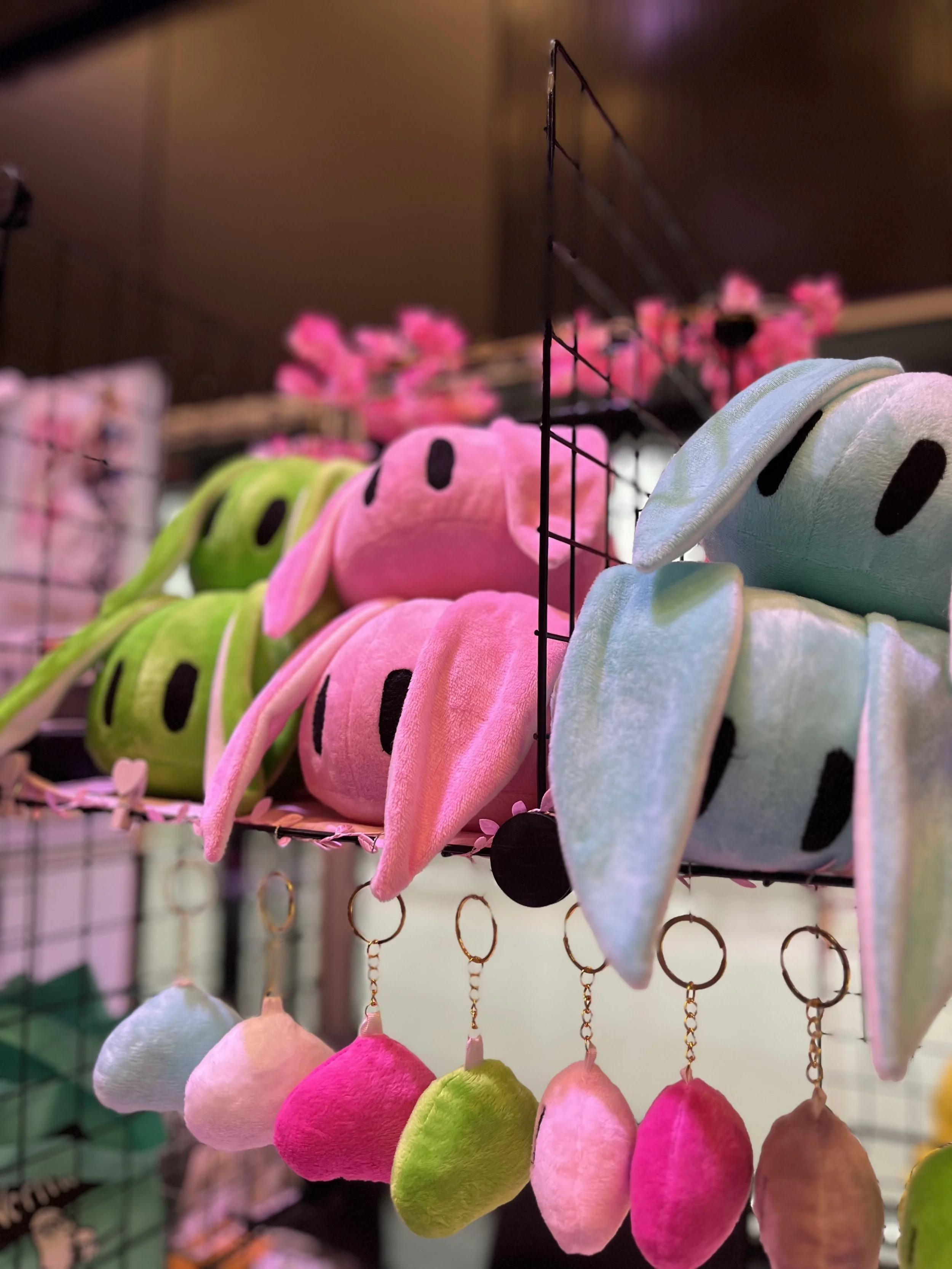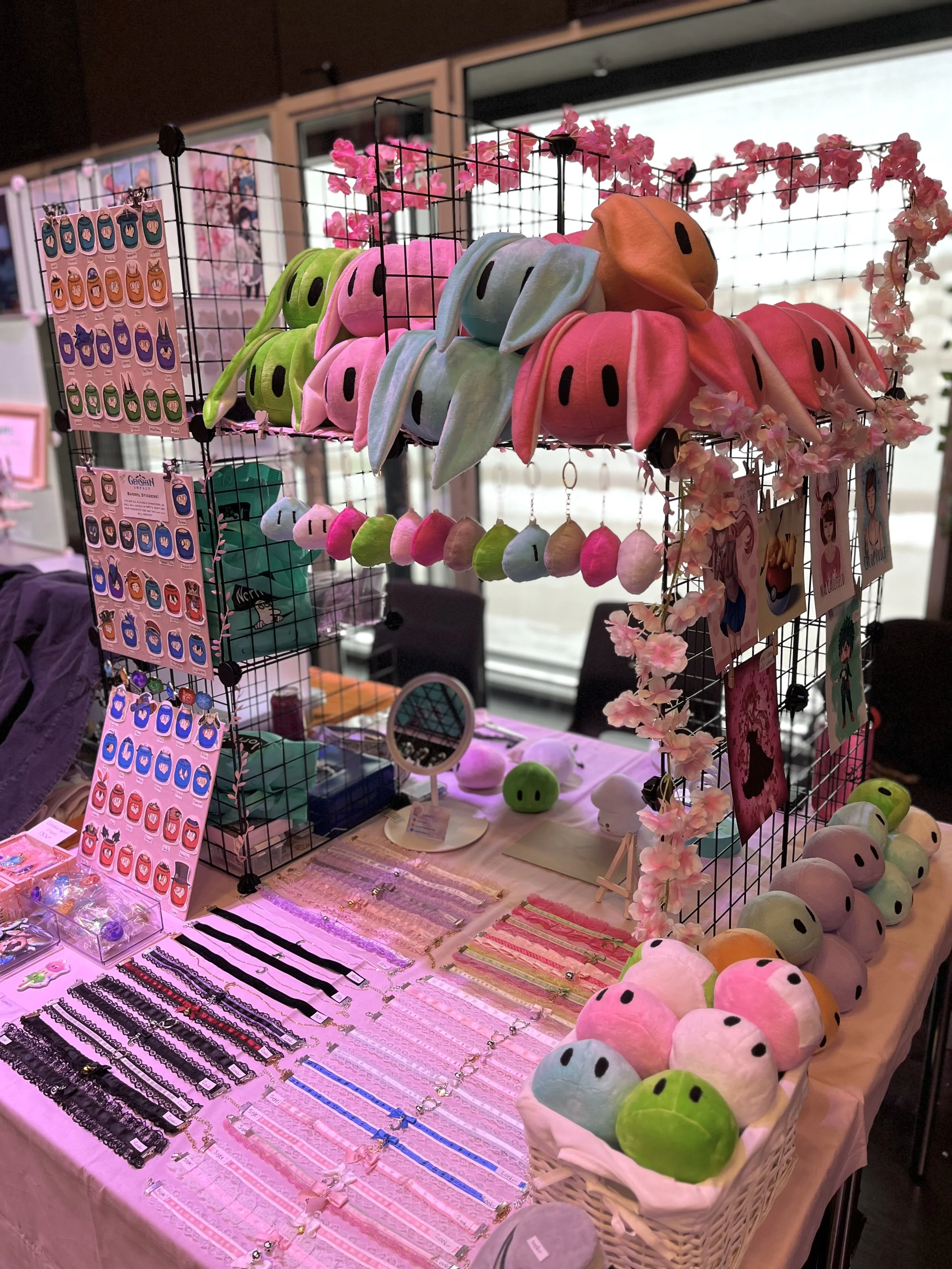 Jeg har holdt på med artstand siden 2015, så i år er det 10år jubileum for standen! Folk kjenner ofte igjen dangoene, de runde klumpene med kanin ører, og det er så koselig <3 Ved siden av dangoer, lager jeg chokers, stickers og keychains/buttons. De siste åra har Genshin Impact barrel stickers vært en morsom greie, og det kan hende det snart kommer noe nytt sticker tema! Stil på både stand og varer er veldig rosa og ”cutesy“, men her er alle velkomne <3